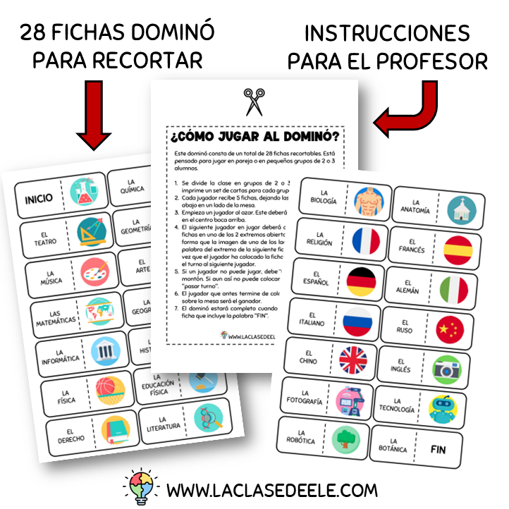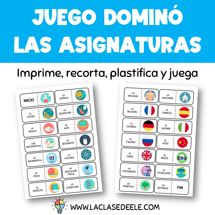 JUEGO DOMINÓ CON VOCABULARIO DE LAS ASIGNATURAS ESCOLARES EN ESPAÑOL