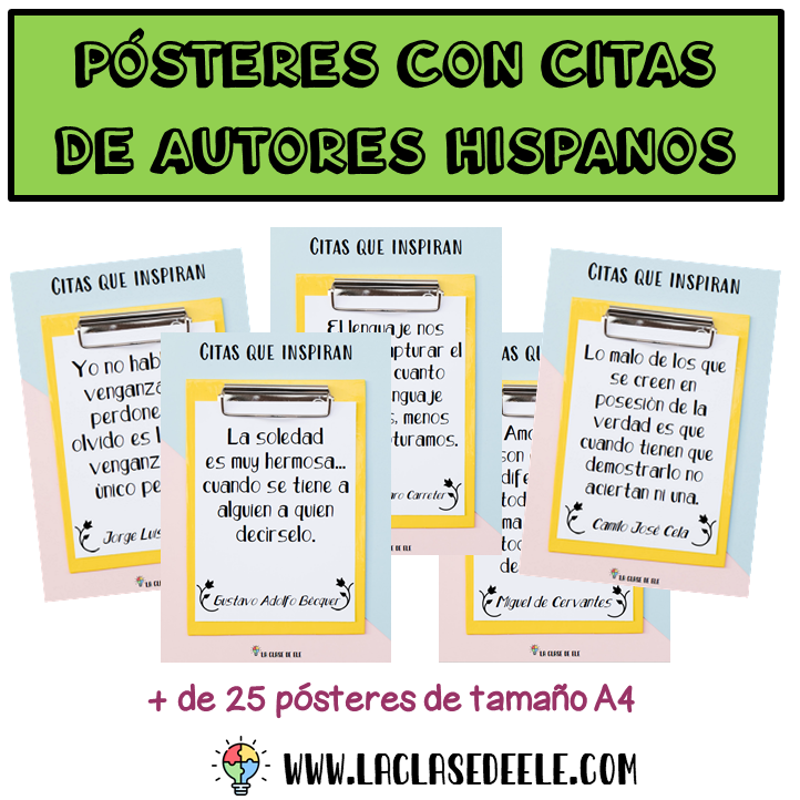 Este recurso incluye 30 pósteres en formato A4 con citas inspiradoras sobre diferentes temáticas en español. Las citas pertenecen en su mayor parte a novelistas, ensayistas, poetas y/o filósofos hispanos famosos tales como: Miguel de Cervantes, Ortega y Gasset, Pablo Neruda, Gustavo Adolfo Bécquer, Rubén Darío, Jorge Luis Borges, Fernando Lázaro Carreter, Julio Cortázar, Eduardo Galeano, Almudena Grandes, Rosalía de Castro, Santa Teresa de Jesús, etc.