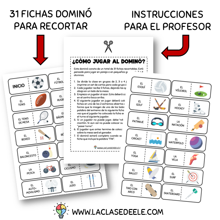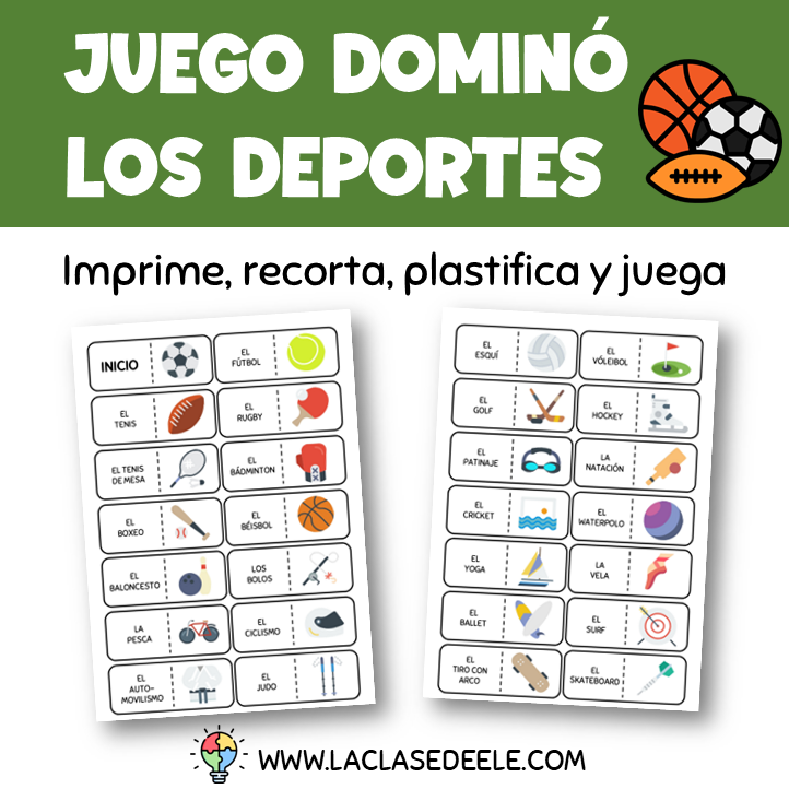Este recurso es un dominó encadenado para trabajar el léxico de los deportes de una forma lúdica. Consta de un total de 31 fichas de dominó recortables para que los estudiantes aprendan el nombre de 30 deportes en español. También incluye instrucciones de cómo jugar para el profesor.