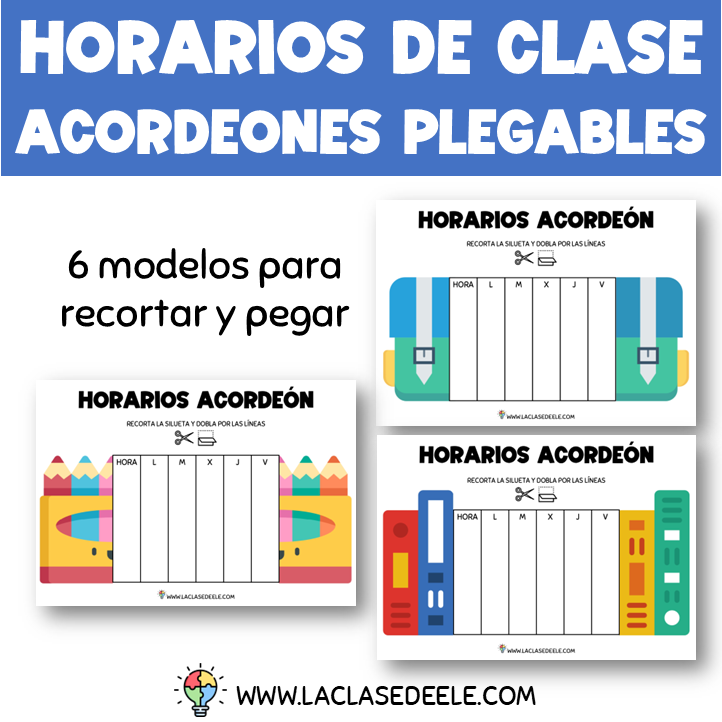 Este recurso incluye 6 modelos diferentes de horarios-acordeón listos para imprimir, recortar y doblar. Son ideales para regalar a los estudiantes los primeros días del curso. Una vez doblados no ocupan mucho espacio, por lo que son perfectos para guardar en el estuche o en una carpeta, y así tenerlos siempre a mano.