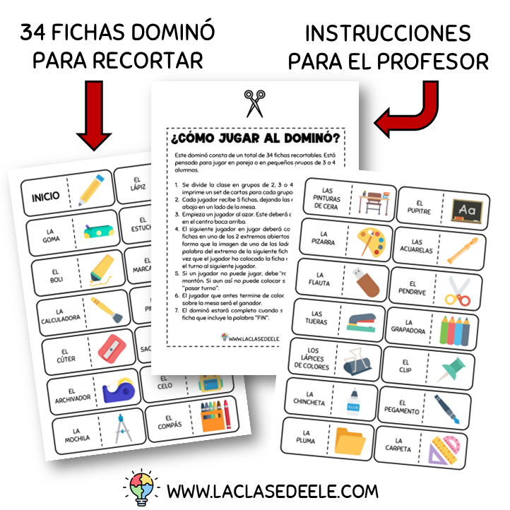 JUEGO DOMINÓ CON VOCABULARIO DEL MATERIAL ESCOLAR EN ESPAÑOL