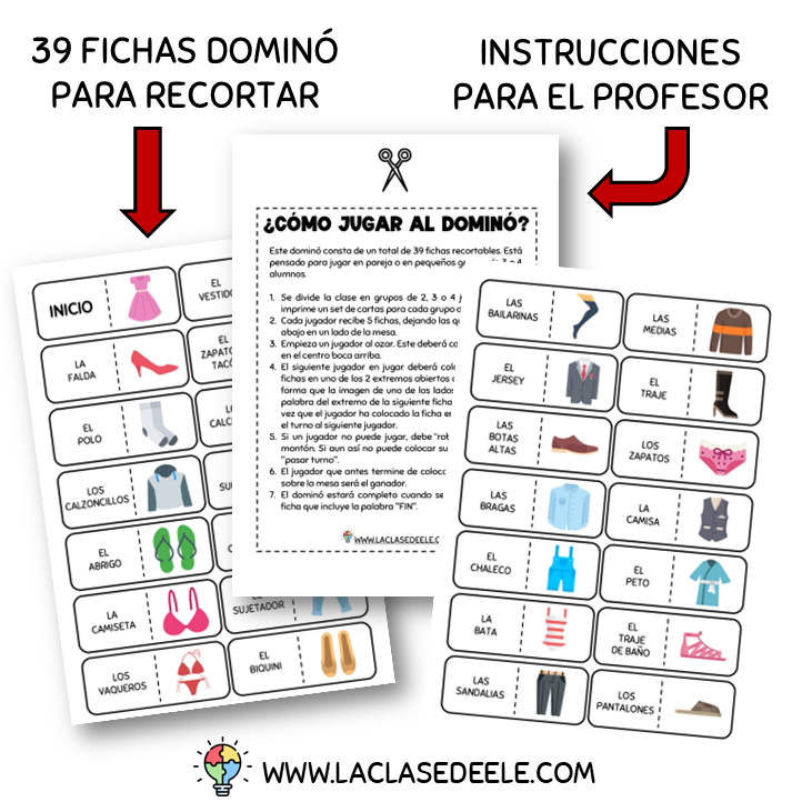 Este recurso es un dominó encadenado para trabajar el léxico de la ropa y el calzado de una forma lúdica. Consta de un total de 39 fichas de dominó recortables para que los estudiantes aprendan el nombre de 38 prendas de ropa y zapatos en español. El juego se puede llevar a cabo en parejas, en pequeños grupos o incluso de forma oral con toda la clase. También se incluyen instrucciones de cómo jugar para el profesor.