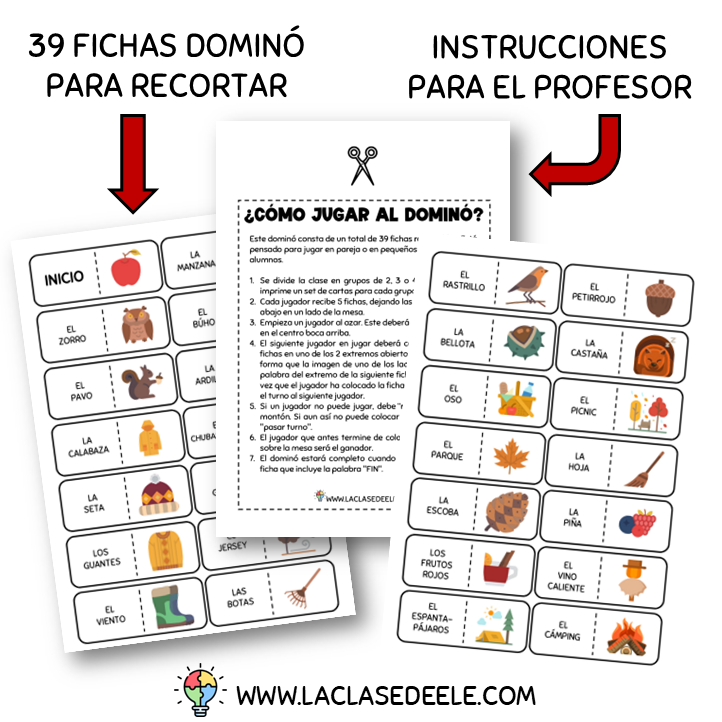 Este recurso es un dominó encadenado para trabajar el vocabulario del Otoño de una forma lúdica. Consta de un total de 39 fichas de dominó recortables para que los estudiantes aprendan el vocabulario de 38 palabras relacionadas con la estación otoñal en español. También incluye instrucciones de cómo jugar para el profesor.